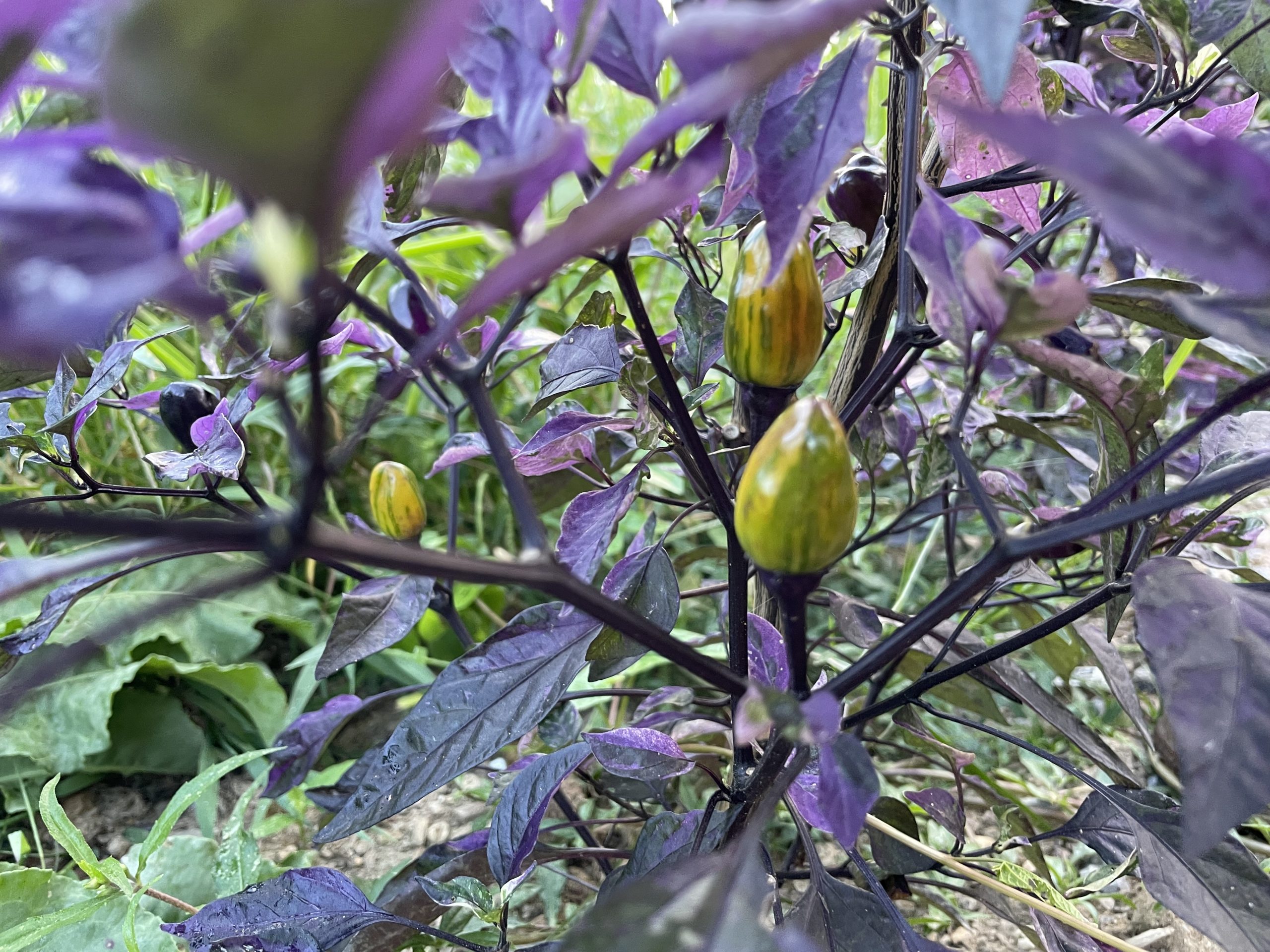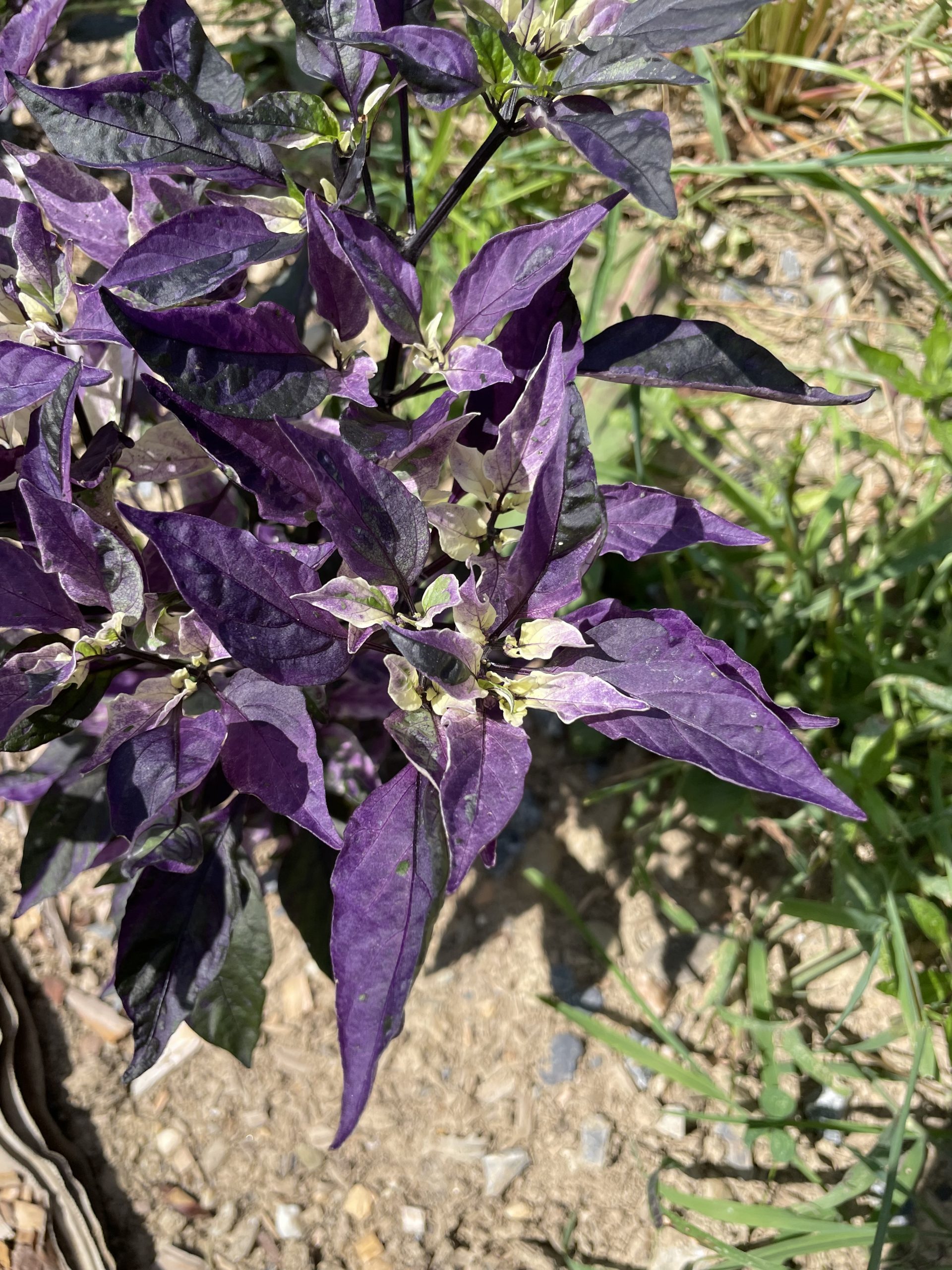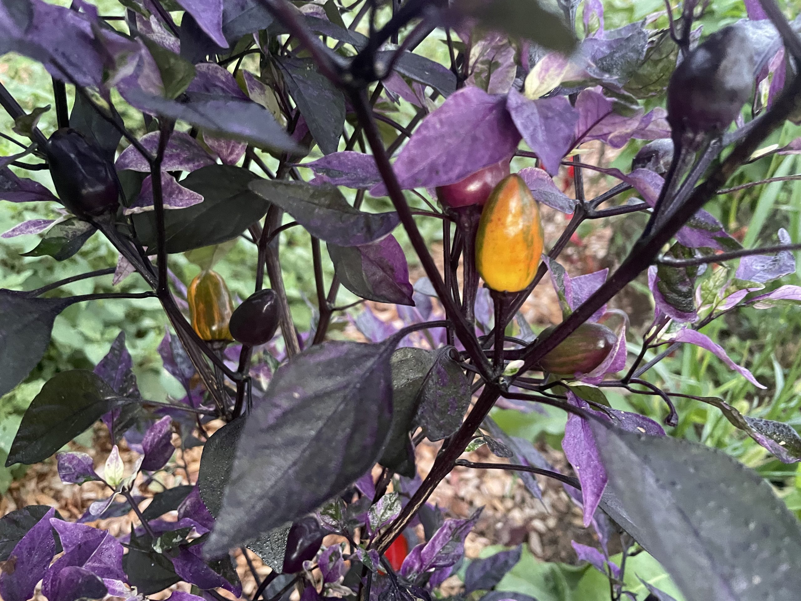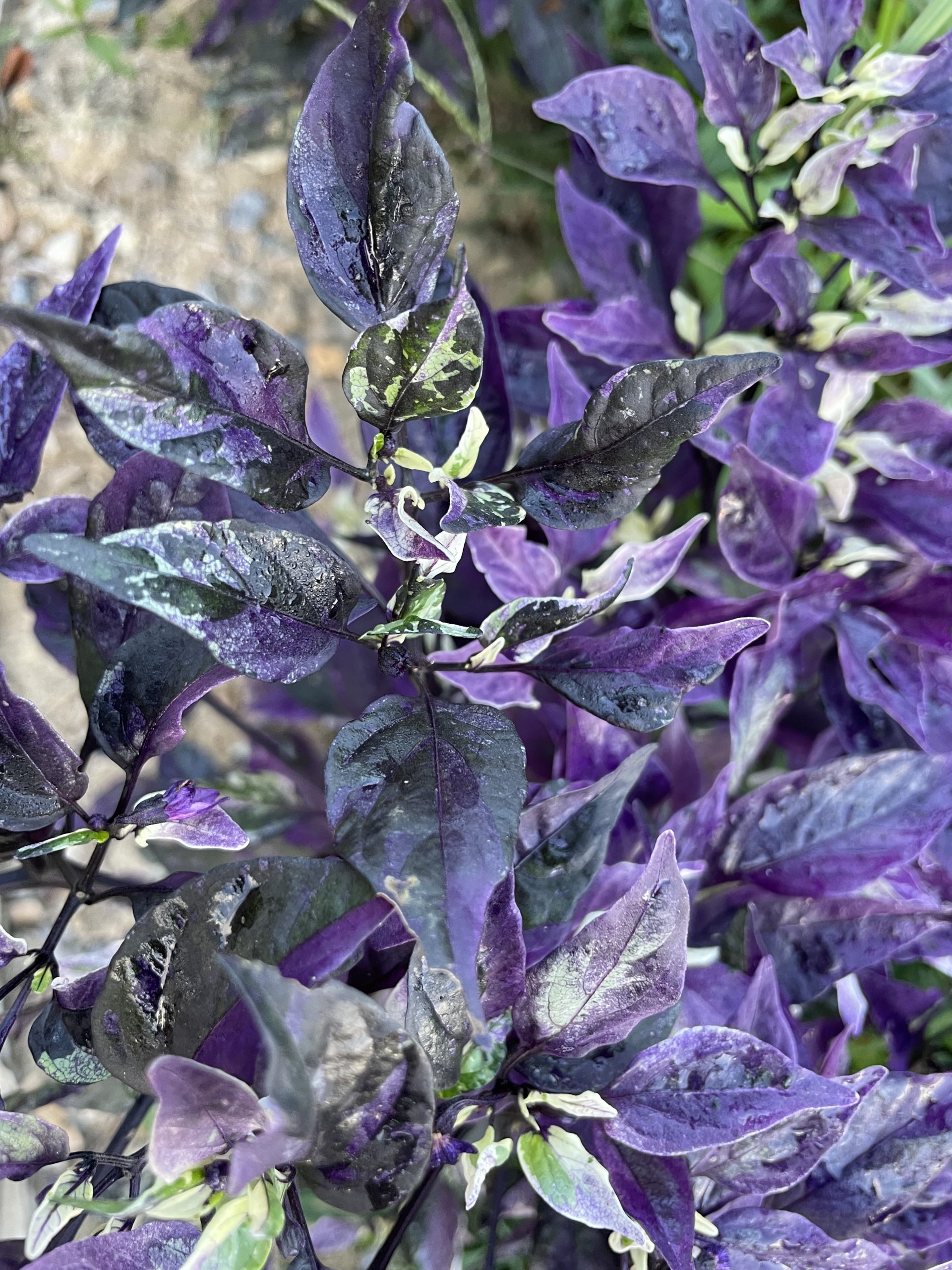 The most beautiful foliage we have ever seen on a pepper plant, hands down.  Stunning mixed, dark and variegated foliage come in brilliant shades of purple with accents of black, white, pink and shades of green.