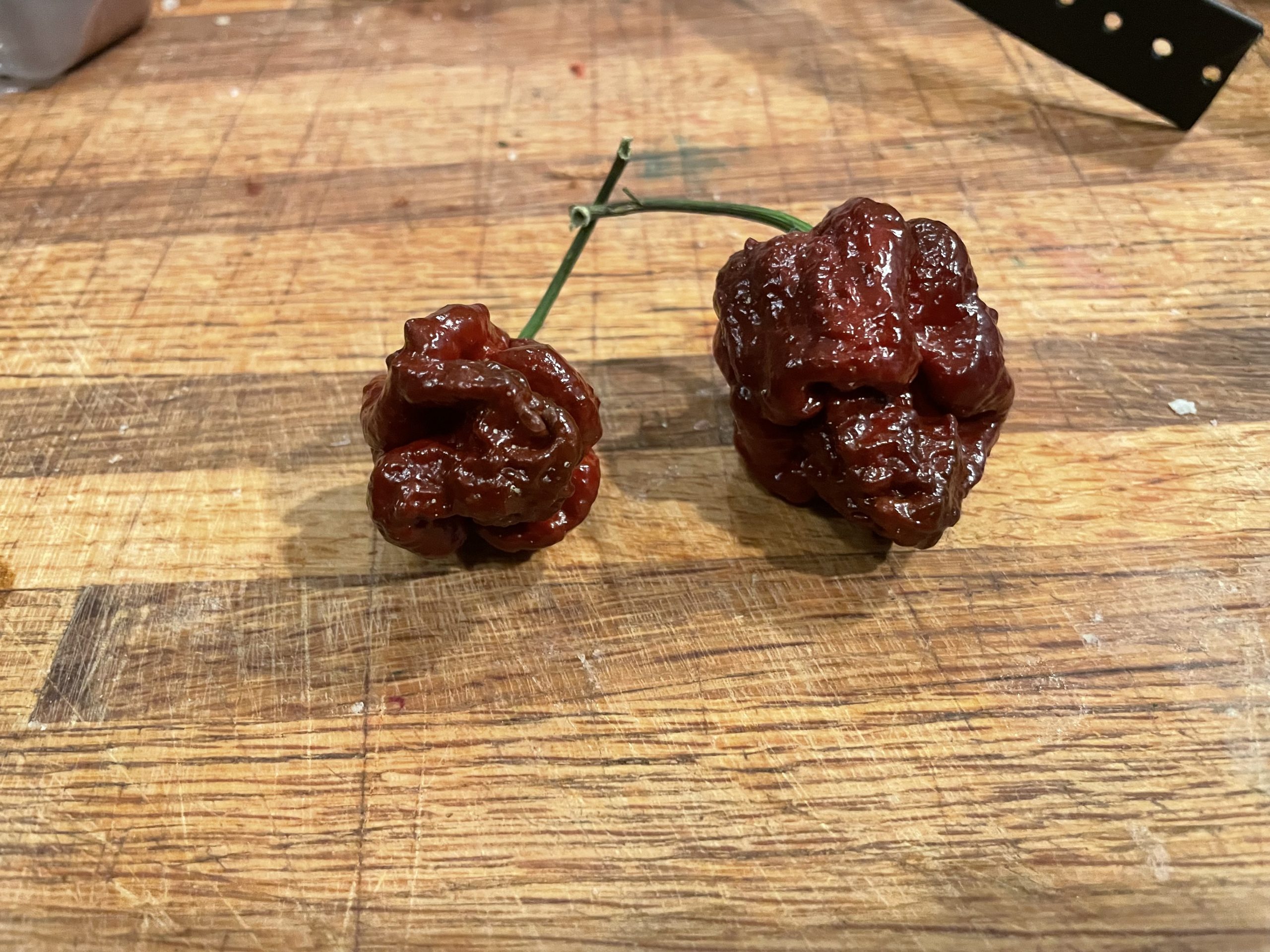 This one is packing some pain!  Developed to grower Jeff Remmert, this is a cross between a Carolina Reaper, 7 Pot Red and Chocolate Bhutlah.  Large, fairly productive plants,