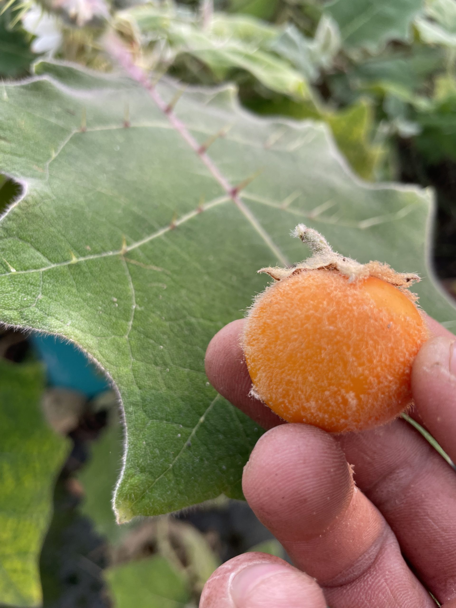 A perennial if brought indoors for the winter (our plants are currently over four years old!), these are a truly unique plant to grow!  Fuzzy, spiked leaves stems and fruit.  When cut open they resemble a tomato, but the skin is tougher and the taste is also slightly umami but very brightly acidic and with a lot of citrus flavor – hence the name “Little Orange”!